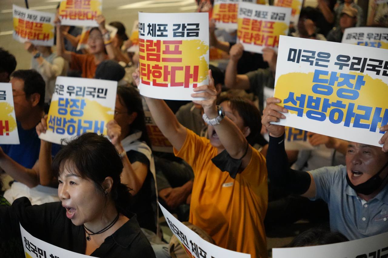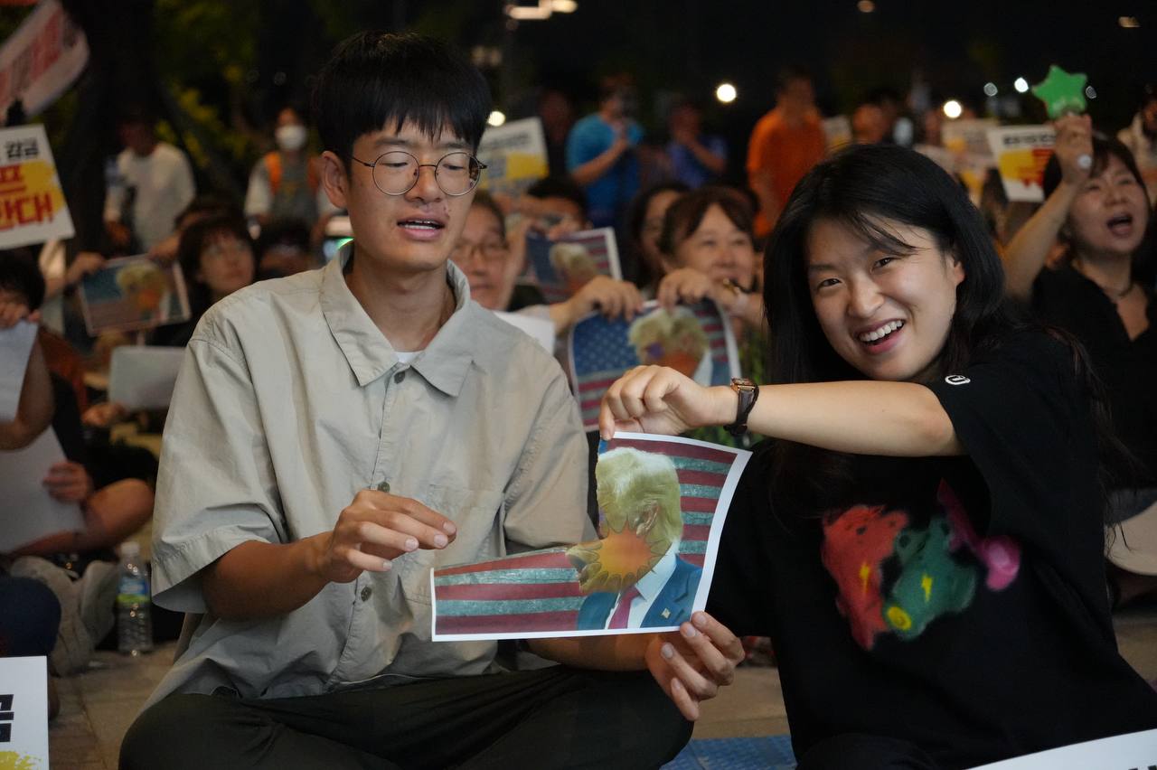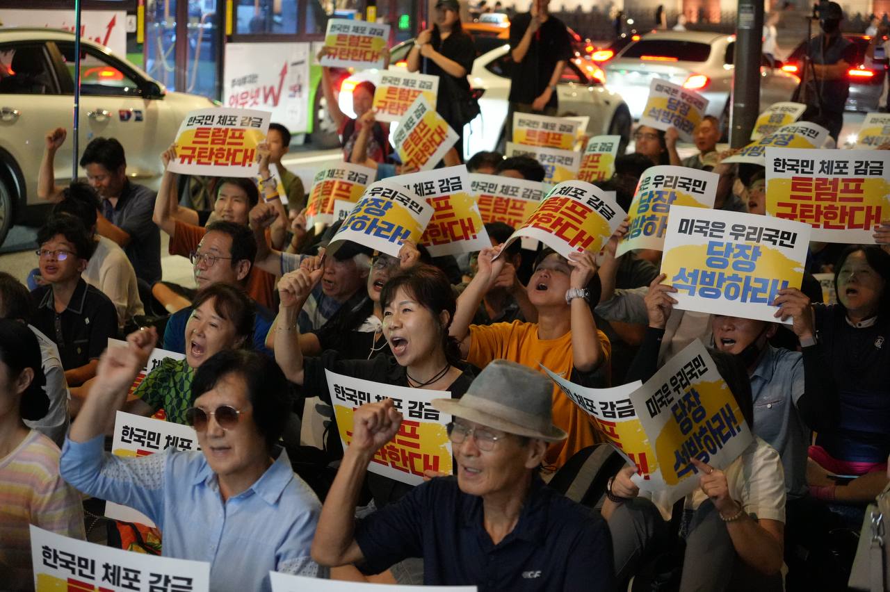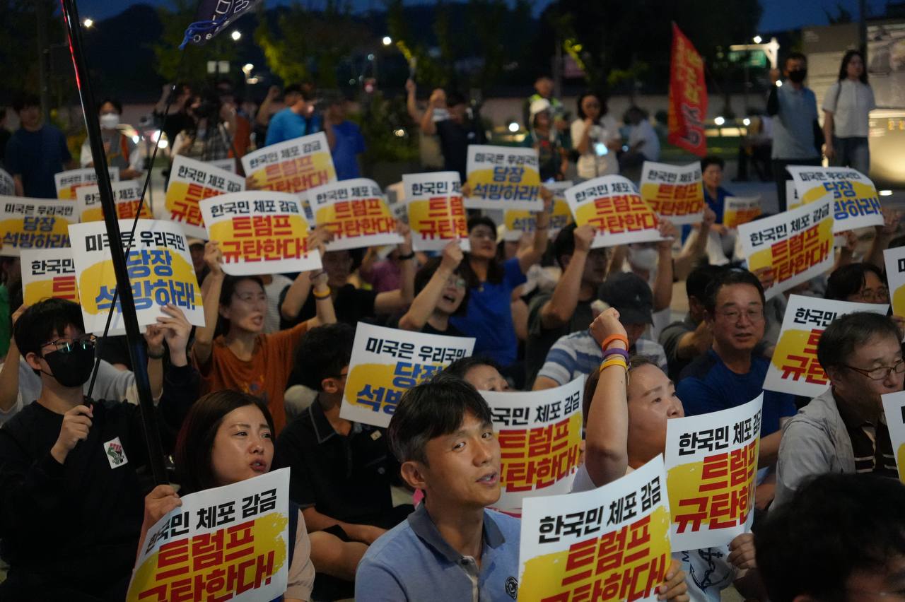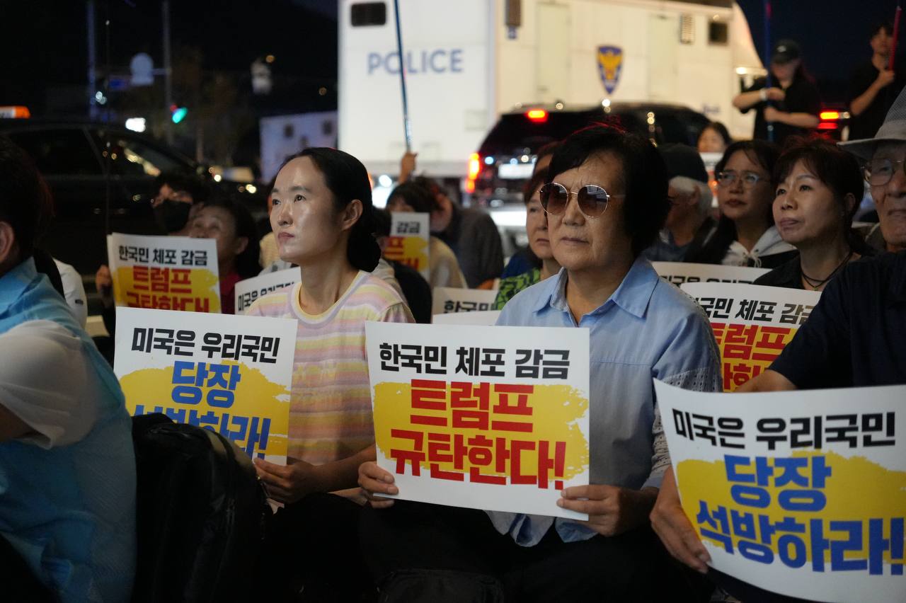 소식/활동 소식 2025. 9. 10. [사진] 9/8(월) 우리 국민 체포 감금한 트럼프 규탄 및 석방 촉구대회 글자 작게 글자 크게 인쇄 공유 닫기 이 글을 공유합니다. 카카오스토리 페이스북 네이버블로그 트위터 링크복사 글 작성 : 2025년 09월 10일 글 제목 : [사진] 9/8(월) 우리 국민 체포 감금한 트럼프 규탄 및 석방 촉구대회 ■ 중계 영상 ■ 사진 (왼쪽) 신동호 자주민주통일민족위원회 공동대표 (오른쪽) 고은광순 평화어머니회 상임대표 (왼쪽) 김용연 진보당 서울시당 위원장 (오른쪽) 안정은 한국대학생진보연합 상임대표 (왼쪽) 조하경 국민주권당 청년위원장 (오른쪽) 가수 백자 (왼쪽) 이형구 국민주권당 정책위 의장 공유하기 게시글 관리 국민주권당 저작자표시 (새창열림)
