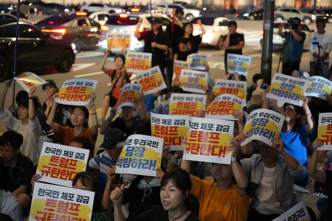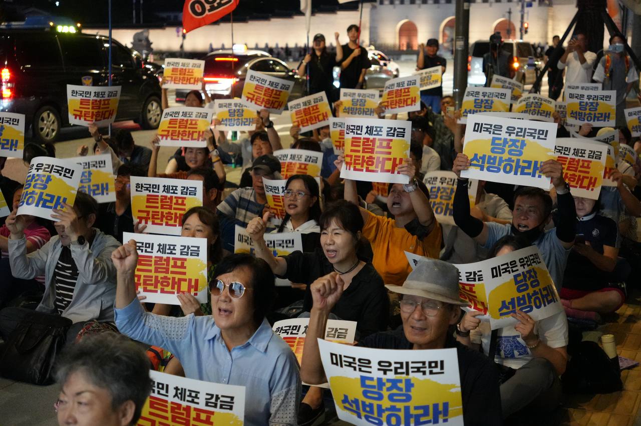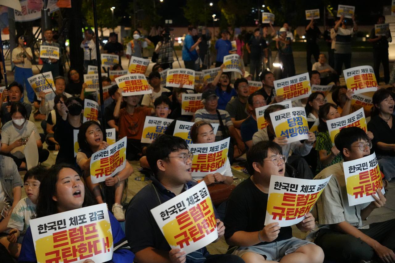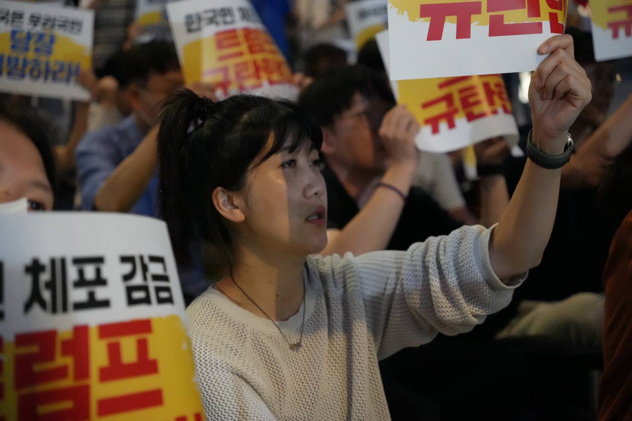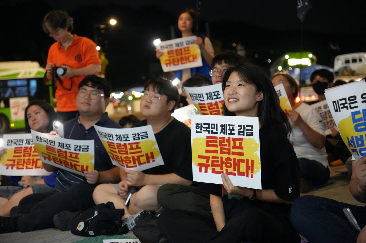 소식/활동 소식 2025. 9. 10. [사진] 9/8(월) 우리 국민 체포 감금한 트럼프 규탄 및 석방 촉구대회 글자 작게 글자 크게 인쇄 공유 닫기 이 글을 공유합니다. 카카오스토리 페이스북 네이버블로그 트위터 링크복사 글 작성 : 2025년 09월 10일 글 제목 : [사진] 9/8(월) 우리 국민 체포 감금한 트럼프 규탄 및 석방 촉구대회 ■ 중계 영상 ■ 사진 (왼쪽) 신동호 자주민주통일민족위원회 공동대표 (오른쪽) 고은광순 평화어머니회 상임대표 (왼쪽) 김용연 진보당 서울시당 위원장 (오른쪽) 안정은 한국대학생진보연합 상임대표 (왼쪽) 조하경 국민주권당 청년위원장 (오른쪽) 가수 백자 (왼쪽) 이형구 국민주권당 정책위 의장 공유하기 게시글 관리 국민주권당 저작자표시 (새창열림)